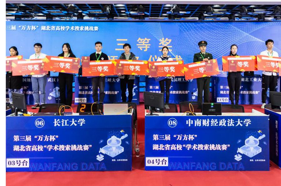颁奖现场比赛现场本网讯(通讯员 尹静)11月6日,为期两天的第三届湖北省高校万方杯“学术搜索挑战赛”决赛在武汉大学图书馆举行。我校图书馆选送的黄振洲、李霁林、刘守阔等3位选手参与此次角逐,最终获得挑战赛三等奖。湖北省学术搜索挑战赛由湖北省高等学校图书情报工作委员会主办。大赛对于提升大学生的信息搜索能力,助力学习科研有着重要意义。第三届挑战赛自今年5月份初赛开展以来,全省共65所高校报名,注册人数达2.3万...