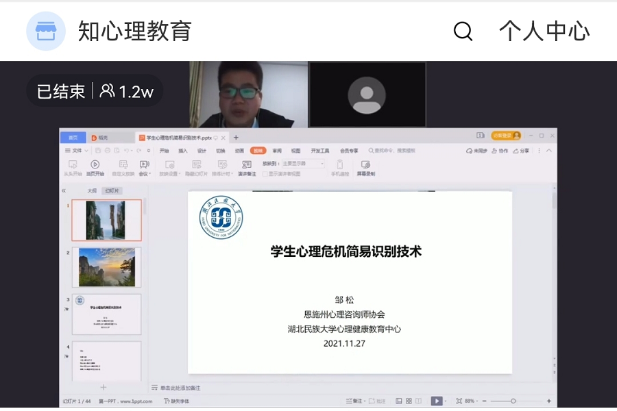 本网讯(通讯员 罗永健)11月28日晚,民进会员、恩施州心理咨询师协会会长、我校心理学教师邹松受湖北省心理学会中小学心理健康教育专委会邀请做客“2021心理健康教育专家讲坛”,通过线上直播作了《学生心理危机简易识别技术》专题讲座。邹松作讲座讲座中,邹松从现实视角介绍了当前青少年存在的心理问题,从关系视角阐释了识别心理危机最便捷的是学生身边的人,从技术层面提出了“1234”学生心理危机简易识别技术;通过“一...