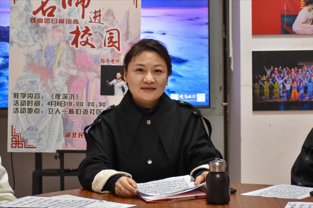 4月8日,我校戏曲团在心语社区举办“名师进校园”指导活动。中国戏剧家协会会员、国家二级演员、湖北省戏剧家协会会员龚敏受邀出席并担任指导教师。龚敏带领学生复习《黄鹤楼》选段,为学生讲解新学曲段《夜深沉》背后蕴含的民族传说,剖析戏剧唱段情感,从咬字清晰、换气自如、节奏控制、情绪抒发等方面指导学生学习选段。龚敏还向学生分享地方戏南剧表演经验与传播地方戏南剧经历,借此让学生了解南剧的发展历史,推广非遗文...