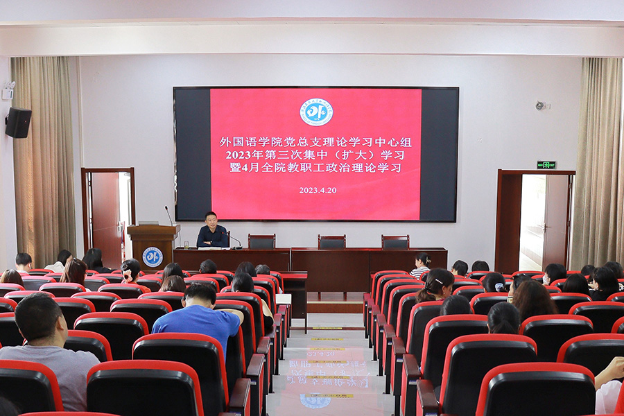 4月20日,外国语学院在学院学术报告厅举行党总支理论学习中心组集中(扩大)学习,第一时间传达学习习近平总书记在中央主题教育工作会议上的重要讲话精神,第一时间对学院主题教育工作进行动员部署。外国语学院党总支高度重视师生政治理论学习,把开展主题教育作为当前重大政治任务,同学习宣传贯彻党的二十大和省第十二次党代会精神相结合,在学习对象全覆盖上下功夫,在学习形式多样性上下功夫,在学习效果提质效上下功夫,号...