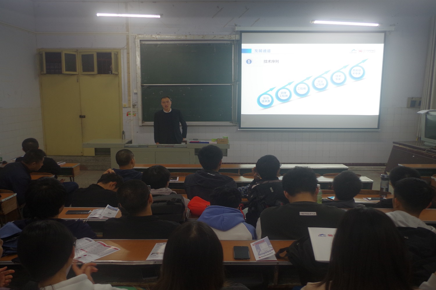 宣讲伊始,邓振泽从公司经营范围、发展历程、工作及生活环境、销售收入等方面对公司进行简单介绍。其中,在谈到销售收入时,他说:“该公司的销售收入从2015年63亿元到2019年122亿元,是非常可观的一面,并且在“十三五”规划中要实现收入150亿元”。同时介绍公司对待员工的薪酬福利以及公司里其它的福利,对公司的企业文化和企业荣誉也进行一番详细介绍。随后,他从技术、操作、管理、销售、职能五个系列讲解公司里的发展通道,并详细告知学生投放简历、初试、副试、签订三方就业协议的应聘流程。最后,进入到学生提问环节,学生提出休假时间多少,工资待遇如何,工作后是否可以继续深造学历等问题,张昊和陈开红对学生的问题进行耐心解答。