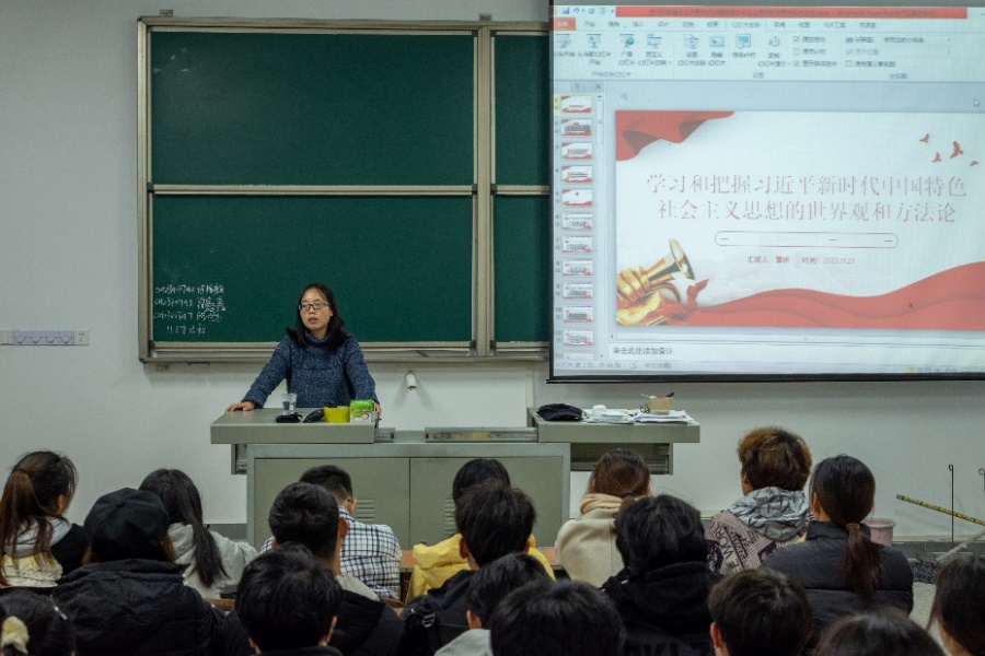 我院本科学生党支部组织委员覃昕以“学习和把握习近平新时代中国特色社会主义思想的世界观和方法论”为主题,围绕习近平总书记在党的二十大中提出的“六个坚持”进行第四次授课。她结合具体案例和现实问题,向在座学生阐述“六个坚持”即坚持人民至上、坚持自信自立、坚持守正创新、坚持问题导向、坚持系统观念、坚持胸怀天下是相互联系、内在统一的有机整体,是世界观和方法论的统一,是在新时代新征程上的实践指南,是中华民族伟大复兴路上战胜一切风险挑战和困难的锐利思想武器。同时,她表示身为大学生,应该认真学习贯彻“六个坚持”,深入领会习近平新时代中国特色社会主义思想,做到知其言更知其义、知其然更知其所以然。