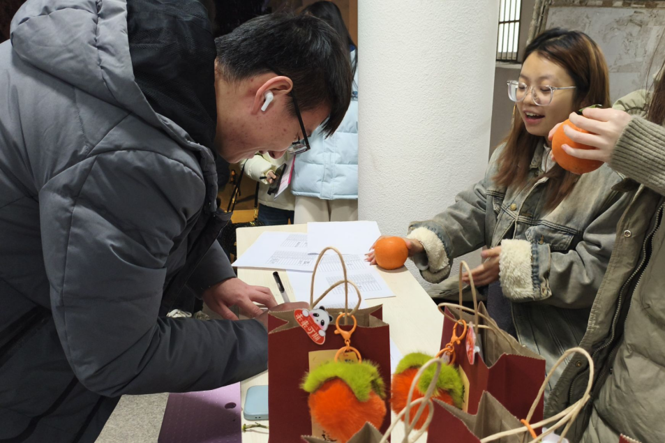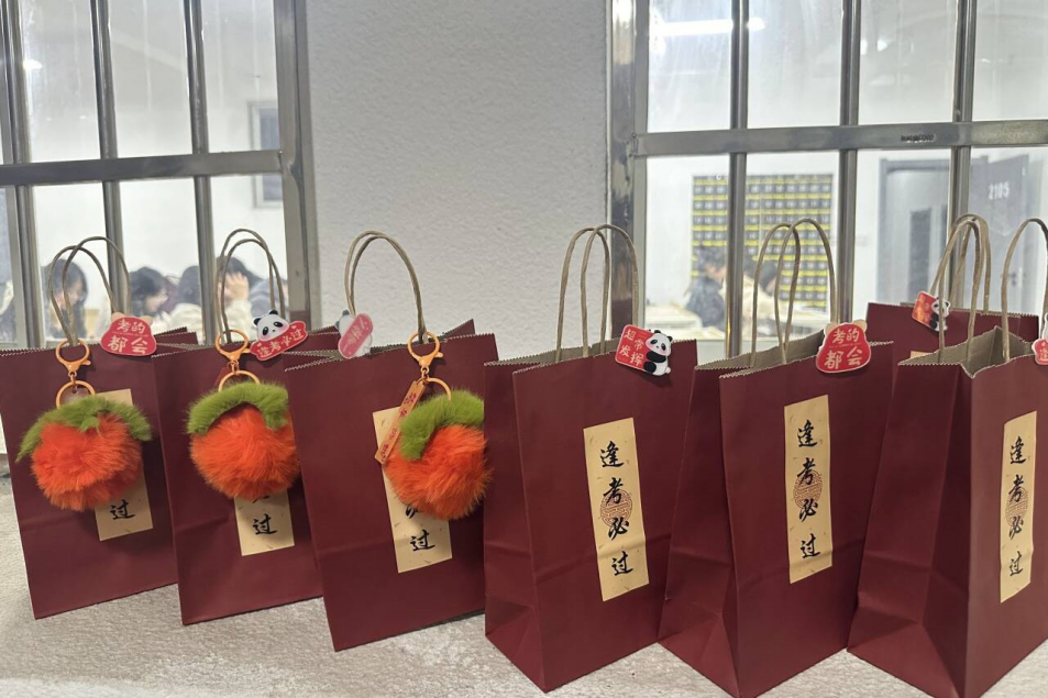 活动现场摆放着一份份为每位考研学子精心准备的礼品袋,包括一片暖手宝,象征寒冬里的温暖与慰藉;一枚“金榜题名”勋章,承载着成功上岸的美好期望;一双袜子,希望学子脚踏实地,稳步前行;一个柿子挂件与一个橙子,寓意学子心想“柿”“橙”,梦想成真;还有由我院近50名教职工手写祝福语的明信片,每一张都饱含老师对学生的殷切期望与深深牵挂。收到满载祝福的礼品后,学生们纷纷表示,这份来自学院的关怀让他们在冽冬感受到浓浓暖意,更加有动力去面对考研挑战。其中一位女同学感慨地说:“备考过程很辛苦,压力也很大,但学院的这次慰问让我们知道,我们不是一个人在战斗,老师们都在背后支持着我们。每一份礼物都像是一个能量包,让我们更加坚定地走下去!”