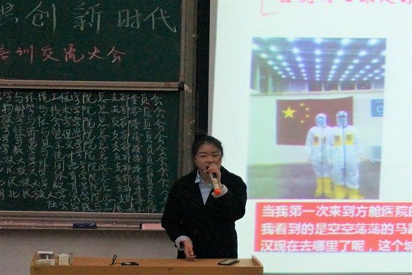 活动伊始,全体志愿者起立合唱《中国青年志愿者之歌》并观看志愿者风采剪影。随后,体育学院覃利萍和法学院罗雅蓝作为志愿者代表上台发言。他们鼓励更多青年加入志愿者行列,在奉献中实现自己的人生价值。接着,抗疫青年志愿者代表杨慧以《我的方舱故事》为题讲述自己的抗疫经历,她希望有更多的同学参与社会实践活动,在社会实践中感悟社会责任,以实际行动促进社会发展。最后,郭锐从“彩虹行动”“爱满荆楚”“留守儿童阅读助成长”“志愿服务”四个方面展开讲解,介绍志愿活动中的一些项目,让大家更加深入了解志愿活动。