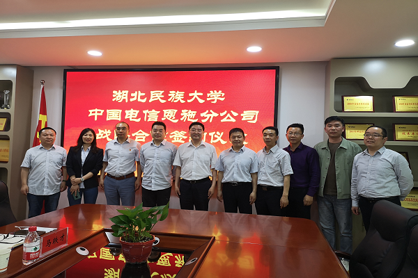 本网讯(通讯员 沈济南)5月28日,我校与中国电信恩施分公司战略合作协议签订仪式在恩施电信会议室举行。我校党委常委、副校长邓磊与恩施州分公司副总经理汪厚瑞代表双方在协议书上签字,恩施州分公司及相关部门负责人,我校信息工程学院等相关部门负责人参加签约仪式。