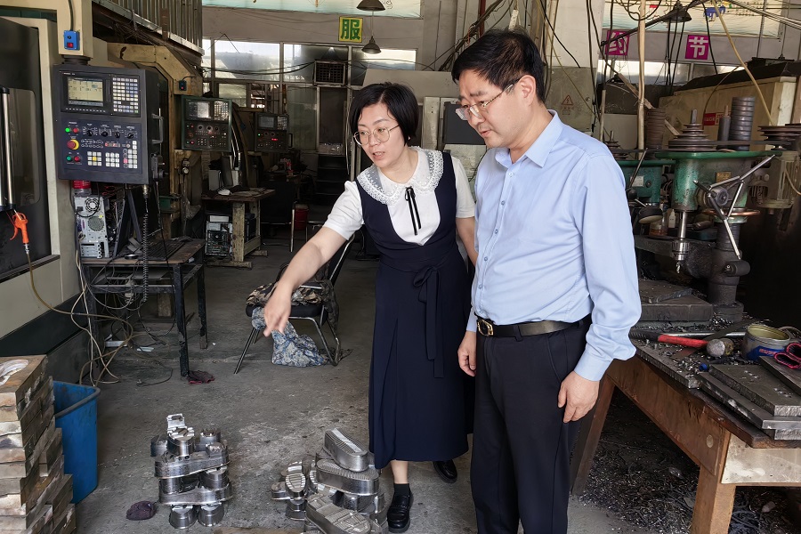 邓磊(右)参观温州麦特模具有限公司生产车间