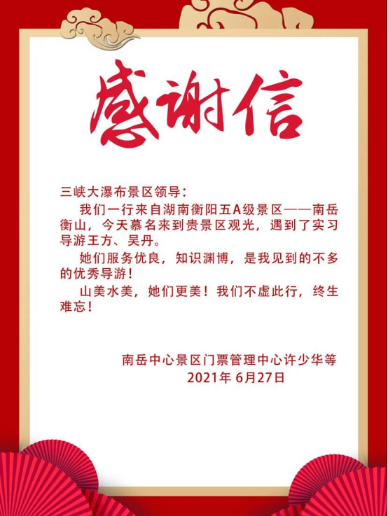 在交流中,还提到了一个小插曲——就在昨天,王方、吴丹两位校方学员作为实习导游在三峡大瀑布景区热情接待了南岳中心景区的观光考察团队,并受到了极高的赞扬。南岳中心景区一行以感谢信的形式,向两位实习导游的职业素养表达了由衷的欣赏。由此可见,校企之间的深度合作,能够让初出茅庐的学员快速融入到真实的景区工作中去,也能为景区的优质人才储备带来新鲜的血液。