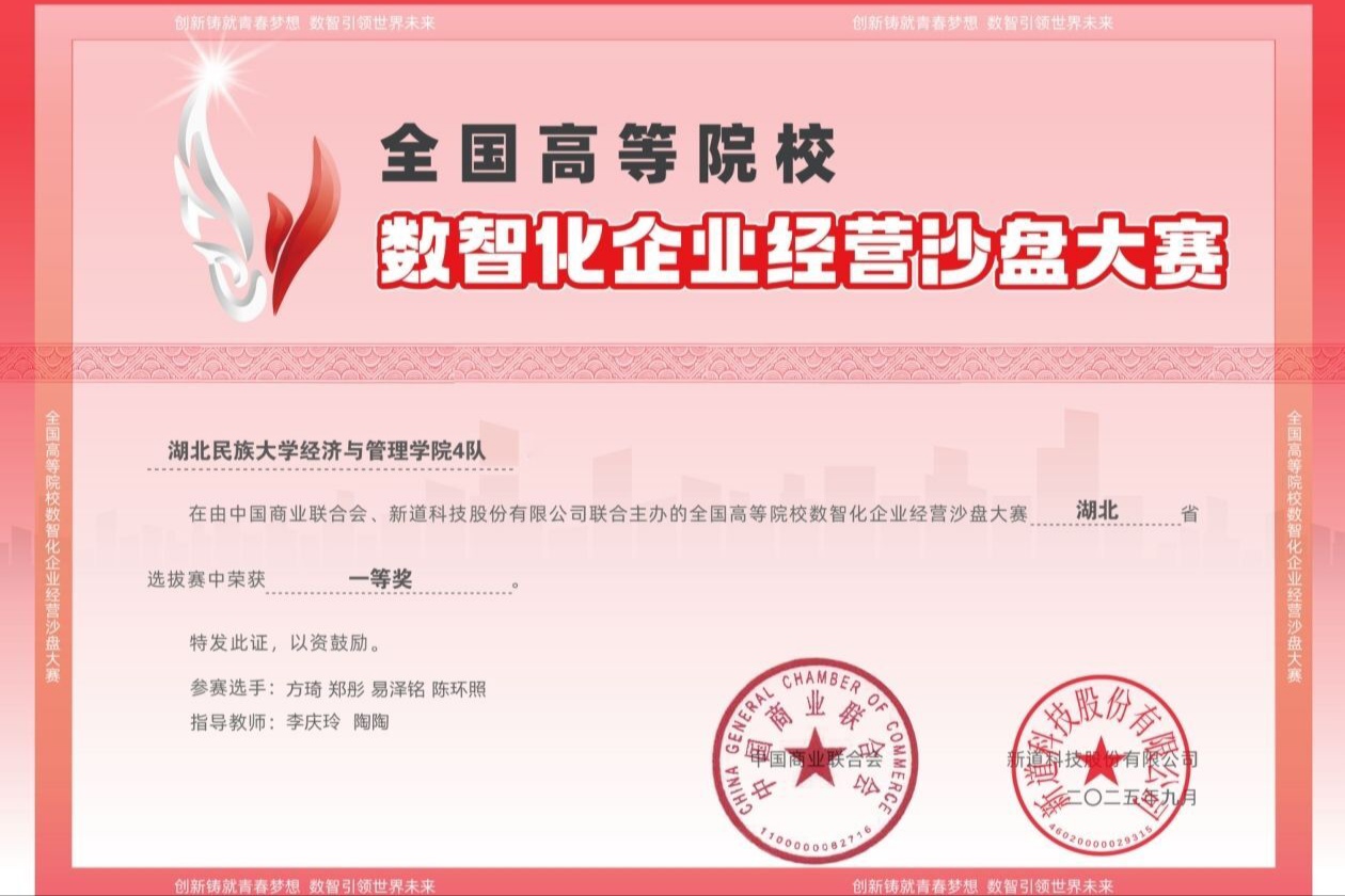 各项竞赛成绩的取得,充分彰显经济与管理学院所秉持的“以赛促学、以赛促教”育人理念,体现学院在创新应用型人才培养方面的卓越成效,是教学改革与实践融合的大胆尝试。同时,学生通过参与竞赛提高个人综合素养、增强就业核心竞争力,为顺利就业奠定坚实基础。未来,学院将持续深化教学改革相关工作,完善多元协同育人机制,助力学生在创新中成长、在实践中成才。(责任编辑 杜秋畅 审核 牟超兰)