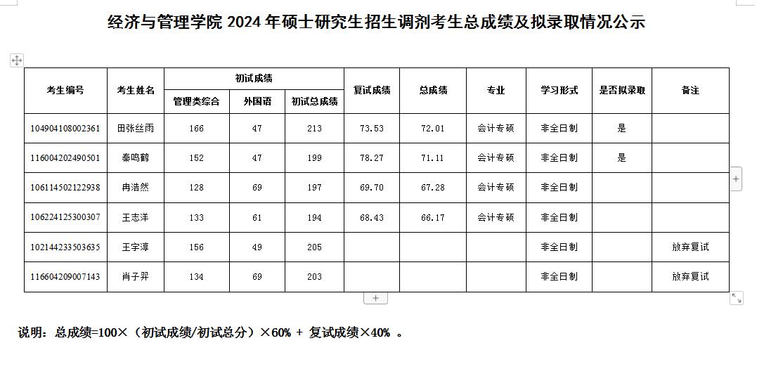 经济与管理学院2024年硕士研究生招生调剂考生总成绩及拟录取情况公示