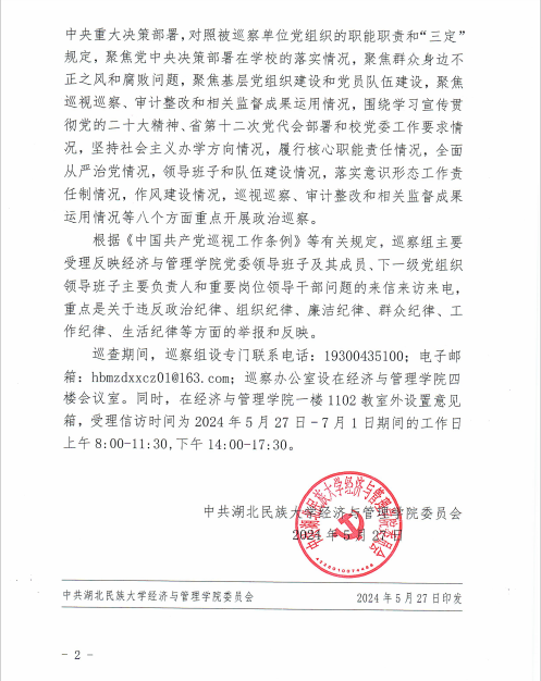 关于开云电竞官方网站入口一届党委第二轮巡察工作第一巡察组进驻经济与管理学院的情况通报