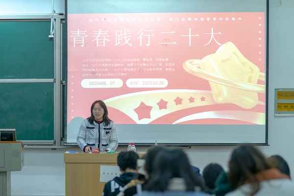 本网讯(记者 蔡雯嘉/文 胡蝶/图)2023年2月26日,经济与管理学院以“青春践行二十大”为主题的团日活动在修远楼5B406教室举行。马克思主义学院副教授张蔚玲,经济与管理学院20级辅导员解丽娟受邀出席本次主题团日活动。