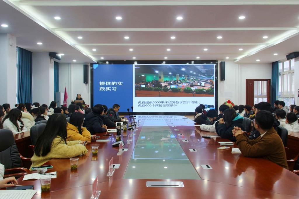 李秋萍作分享。她首先介绍华南电商产业科技有限公司概况,提到该公司将为学生提供实习实践机会,通过实践掌握国际贸易实务知识。她希望学生能够提前了解用人单位需求,提高专业能力,为后期就业工作做好准备。