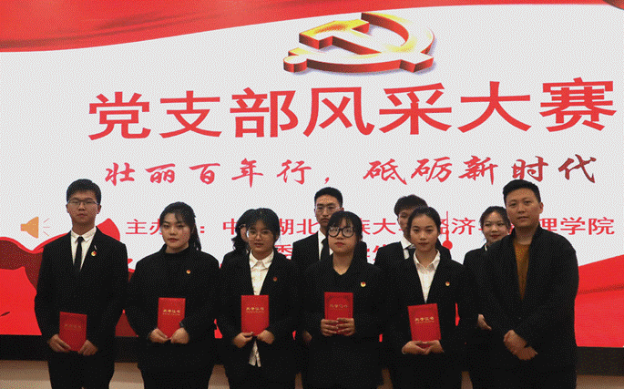 本网讯(记者 俞静 毛林 许思俊 黄东煜/文 熊海婷 李瑶/图)2021年4月15日,经济与管理学院“壮丽百年行,砥砺新时代”学生党支部风采大赛在经管楼附303会议室举行。经济与管理学院党委委员、副院长朱廷辉,党委组织部党校办公室主任向驰,学生第一党支部书记、学生科科长曹骞,会计系教师刘洁玫,团支部书记张典应邀出席并担任此次比赛评委。学生科老师覃杰、向绍阳担任主持人。最终,梦之队摘得比赛桂冠。