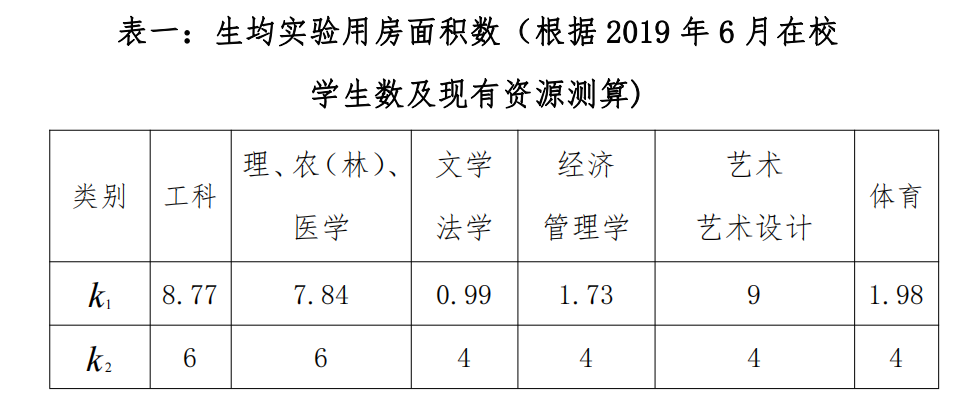 第四条学校根据教育部制定的《普通高等学校建筑面积指标(建标191-2018)》及学校现有资源测算各单位各专业实验用房面积。相关专业实验室面积计算方法为:(=(."B+*k*Y)。其中K是不同专业类别的生均面积数,k,是不同专业性质研究生生均补面积数,k、k,取值如表1所示。B.是该专业本科生人数,y,是该专业研究生人数。二级教学单位实验用房控制面积为所属各专业应分配面积之和的80%,主要用于二级教学单位的教学与科研。学校统筹各专业应分配面积之和的20%,主要用于公共基础课实验室面积补贴、公共科研平台建设及学科团队的引进。