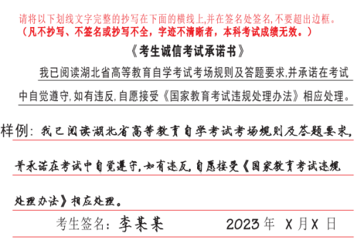 5.主动配合课程笔迹信息采集。按规定在答题卡指定区域完整抄写《考生诚信考试承诺书》(抄写样例如下图),凡不抄写、不签名或抄写不全,字迹不清晰者,该科考试成绩无效。毕业时省教育考试院将对每张答题卡上的《考生诚信考试承诺书》笔迹进行复核,凡笔迹不一致,经鉴定为代考的,将根据《国家教育考试违规处理办法》作出成绩无效、延迟毕业、记入国家教育考试诚信档案等处理。