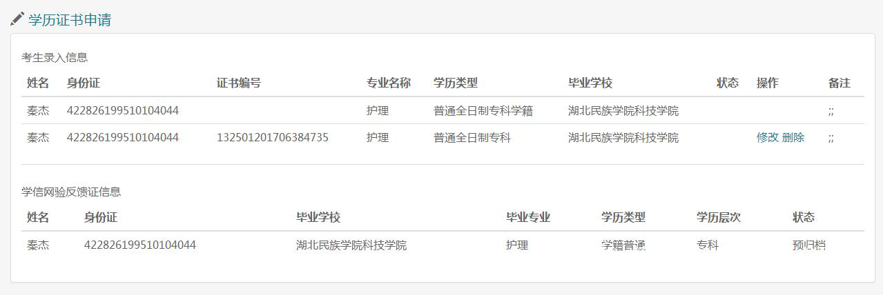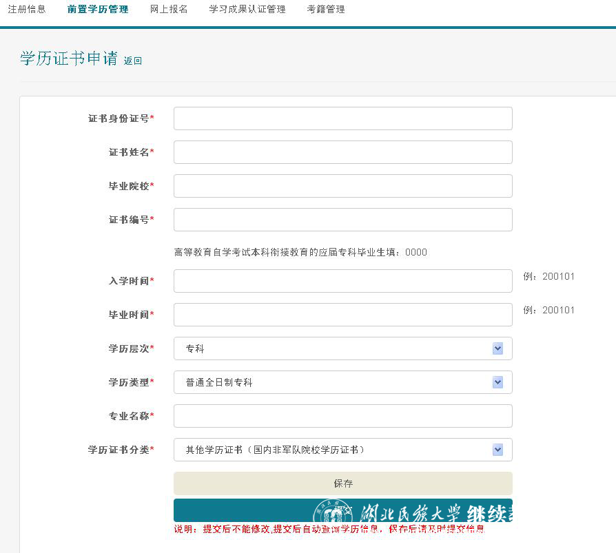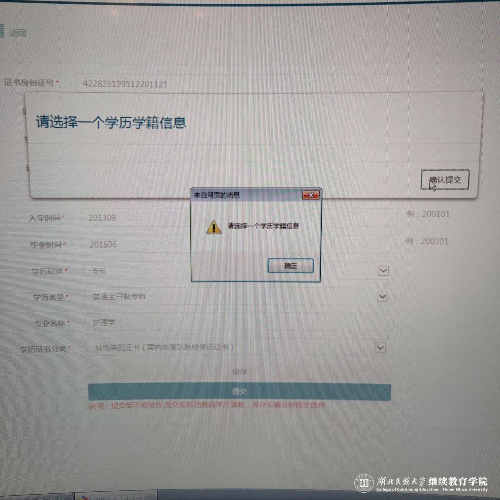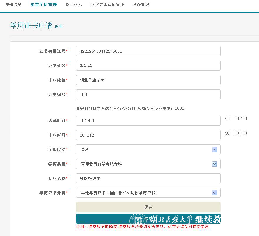 以下页面中注意:选择学历证书为“学历普通专科”,不能是“学籍普通专科”!!!没有学籍普通的在前置学历管理里提交。