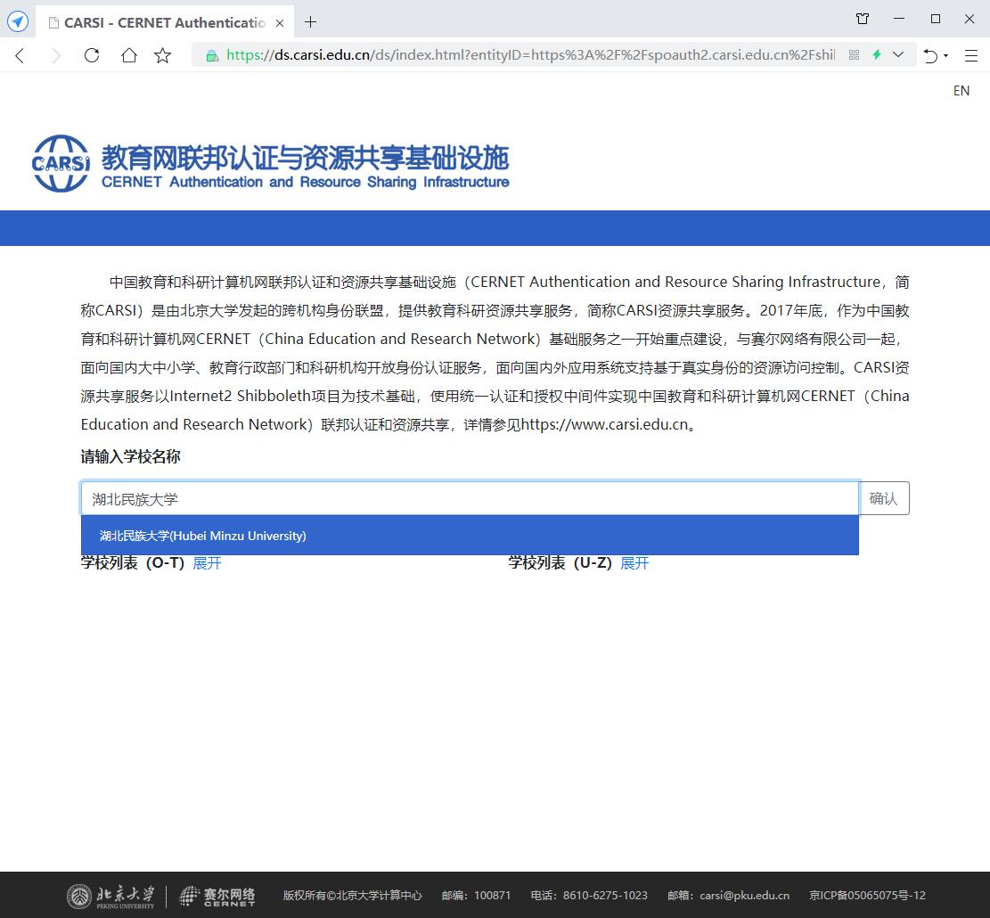 2、进入CARSI机构联盟学校页面,选择所在学校,开云电竞官方网站入口。