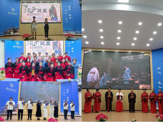 活动现场,师生齐聚一堂,用丰富多彩的形式纪念孔子。通过观看短视频了解孔子的教育理念、道德观念;图书馆勤工助学小组学生诵读《论语》部分篇章诠释经典的力量;施州怡心读书会带来自编自创的情景剧《孔子之歌》,让大家充分感受到孔子思想的博大精深与历久弥新的魅力;知识竞答与观众互动环节生动有趣。最后图书馆教师表演的小组合唱《礼运大同篇》以其深邃的哲思和美妙的旋律,表达了人们向往“大道之行,天下为公”的美好夙愿。