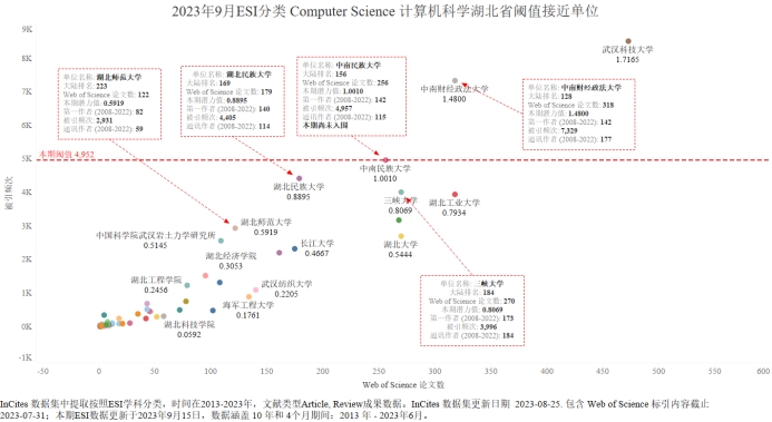 本期我校有望进入ESI前1%的学科为Computer Science 计算机科学,潜力值为0.8895,论文数179,引用量4405,本期入围阈值为4952。