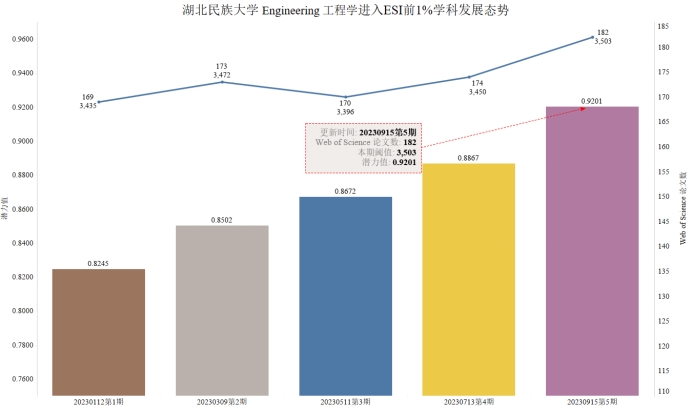 本期我校有望进入ESI前1%的学科为Engineering 工程学,潜力值为0.9201,论文数182,引用量3223,本期入围阈值为3503。
