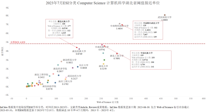 本期我校有望进入ESI前1%的学科为Computer Science 计算机科学,潜力值为0.8749,论文数177,引用量4225,本期入围阈值为4829。