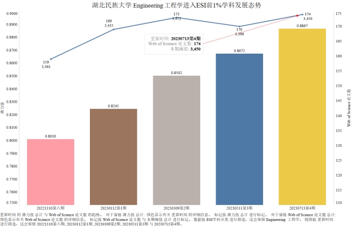 本期我校有望进入ESI前1%的学科为Engineering 工程学,潜力值为0.8867,论文数174,引用量3059,本期入围阈值为3450。