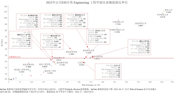 由于InCites 数据集更新于2023-10-27. 包含 Web of Science 标引内容截止 2023-09-30。晚于ESI数据涵盖数据范围2023年8月31日,因此实际发文量和引用量略有增加,会导致潜力值比实际略微偏高。因此尽管湖北文理学院Engineering工程学和中南民族大学Computer Science计算机科学本期潜力值大于1,但仍尚未入围ESI学科前1%