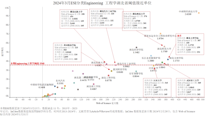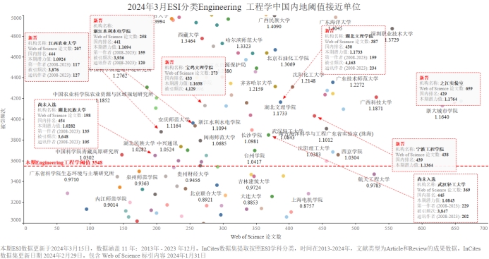 本期我校有望进入ESI前1%的学科为Engineering 工程学,潜力值为1.0282,论文数198,引用量3648,本期入围阈值3548。