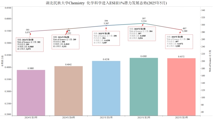 本期我校有望进入ESI前1%的学科Chemistry化学学科,潜力值为0.4372,论文数286,引用量3389,本期入围阈值7752。
