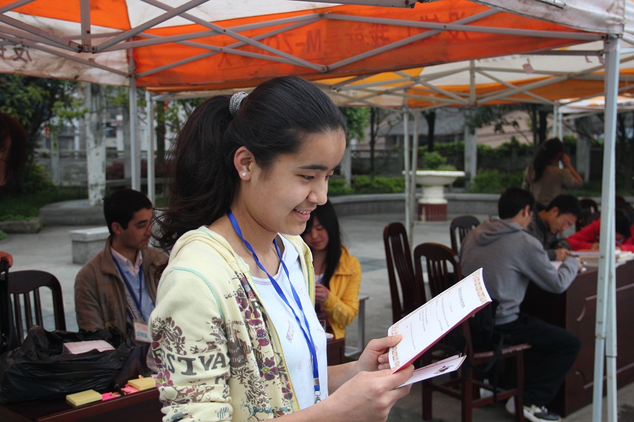 胡尔西旦•爱妮娃尔喜滋滋的观看自己的捐赠证书