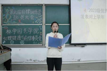 2024级新生代表于海霖分享了自己保持自律的三个方法:明确目标、严格制定和执行计划、学会反思并保持乐观。同时,代表全体新生表态将会积极参加自律训练营,学会严以律己。