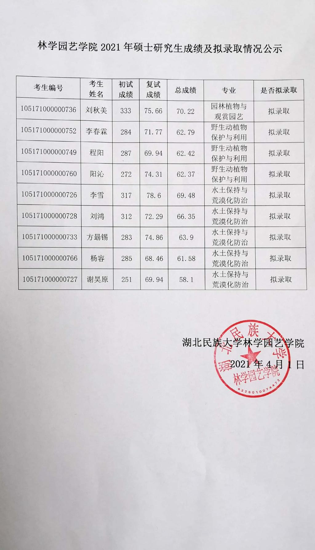 林学园艺学院2021年硕士研究生成绩及拟录取情况公示