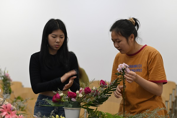 讲解结束后,学生自由组成七个小组,选择合适的花卉材料,在花泥上创作构思插花作品。徐莉老师对各个小组学生进行指导与帮助,学生也从开始的生疏逐渐变得得心应手,各种花卉在学生手下展现出不一样的“风韵”与“灵气”。学生积极参与插花活动中,现场氛围浓厚。