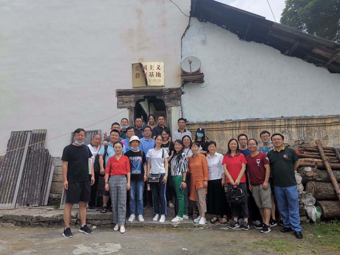 在爱国主义教育基地匾牌前合影