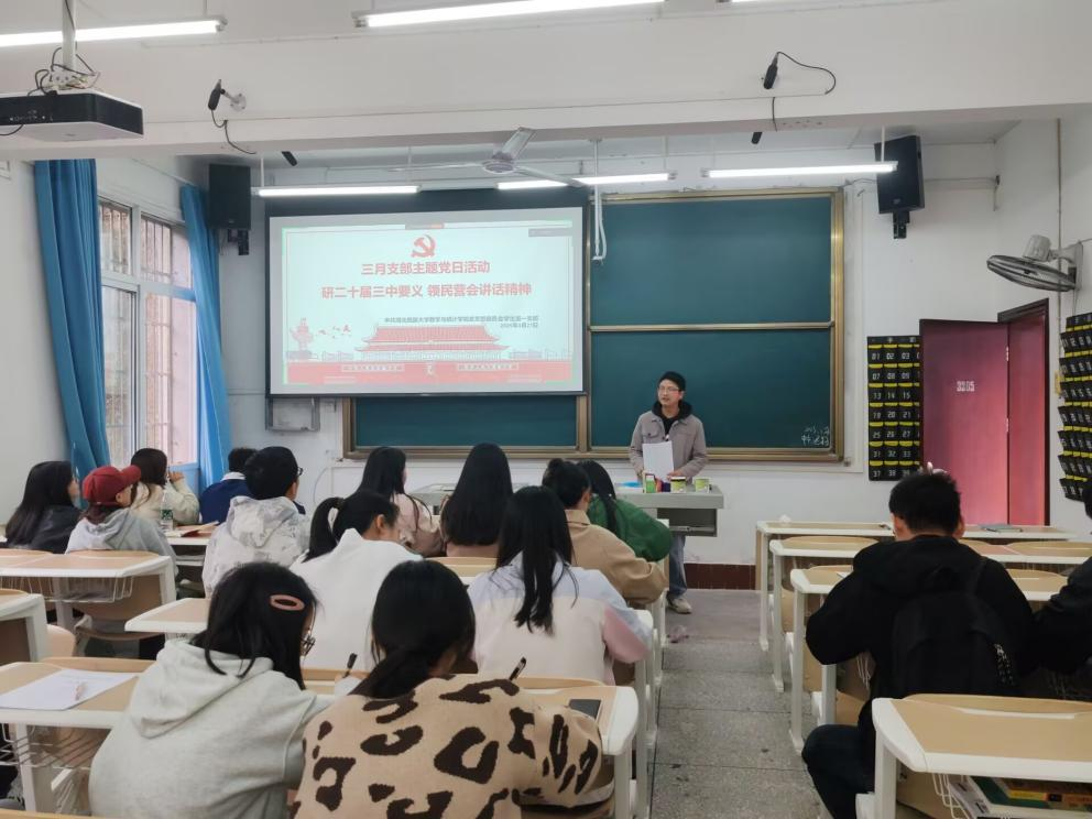 本网讯(记者 张明/文 张明/摄)2025年3月27日下午,数学与统计学院学生第一党支部在3205教室开展主题为“研二十届三中要义,领民营会讲话精神”支部主题党日活动。本次活动由党支部书记廖祥宇同志主持,全体党员参加,气氛热烈。