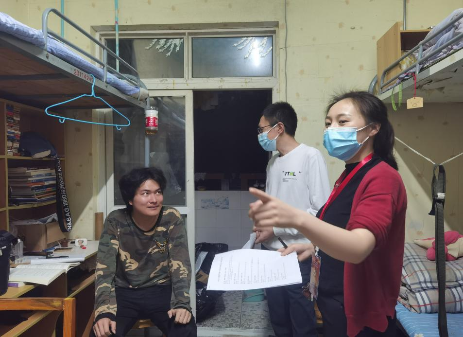 走访初时,老师们时刻不忘党员身份,细心敲门,耐心询问。首先关心寝室硬件设施及水电方面是否能够满足同学们的日常需求,并表示在疫情防控的特殊期间有什么困难可以向学院寻求帮助。同时,学生党员询问了同学对早晚自习的看法、对日常学习的困惑、对未来的想法以及在寝室的人际关系等问题。从各个方面关心同学,认真解答同学们的疑惑,传授自己的经验和心得。
