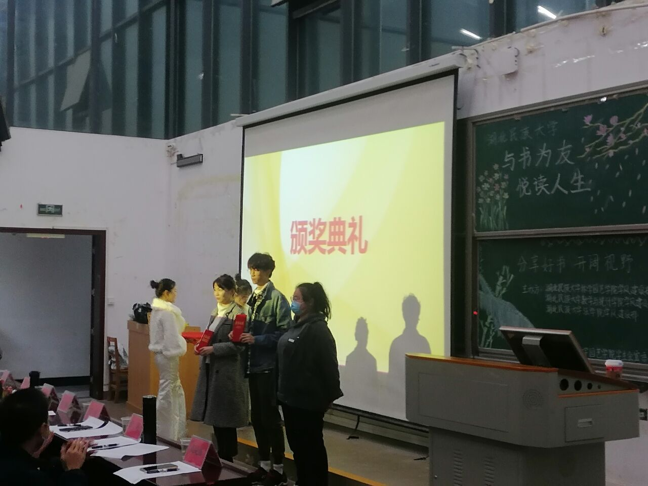 进过初赛的激烈角逐,共有12名同学进入决赛,他们分别将所读的书籍进行分享,首先出场的是杨晅霁同学,他针对自己所读的《乌合之众》发表自己的看法,接着是陈巧玉同学所阅读的《牧羊少年奇幻之旅》,她提到:“每个人的生活并不那么满意,渴望诗与远方,渴望走在路上,在难以实现愿望的时候,读书也是另外一种走在路上的方式,学习书中不甘平庸的牧羊人,最终完成自己的使命。”经过激烈的竞争,杜玉泽获得一等奖。