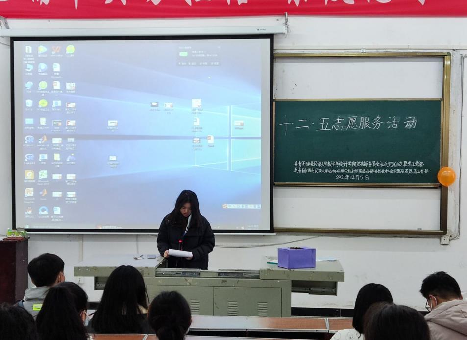 本网讯(见习记者 刘蓟 钱佳凤 唐金凤/文 钱佳凤/摄)12月5日,我院联合生物科学与技术学院在我院3308教室成功举办以“传递志愿精神,展望美好未来”为主题的十二五志愿活动,为做好疫情防控,两院部分青年志愿者到场参加。