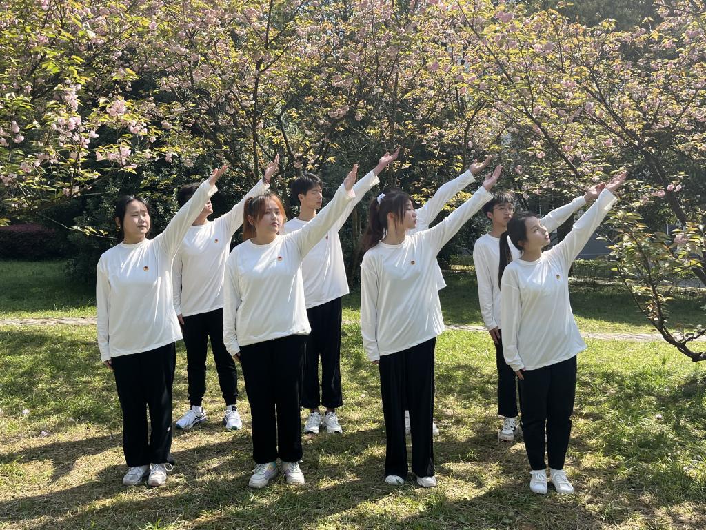本次活动主要内容为在学院门前和樱花园合唱团歌。同学们胸佩团徽,昂首正视,伴随着激昂的旋律,唱响共青团团歌,挥摇手中的团旗。歌声嘹亮,激荡人心。