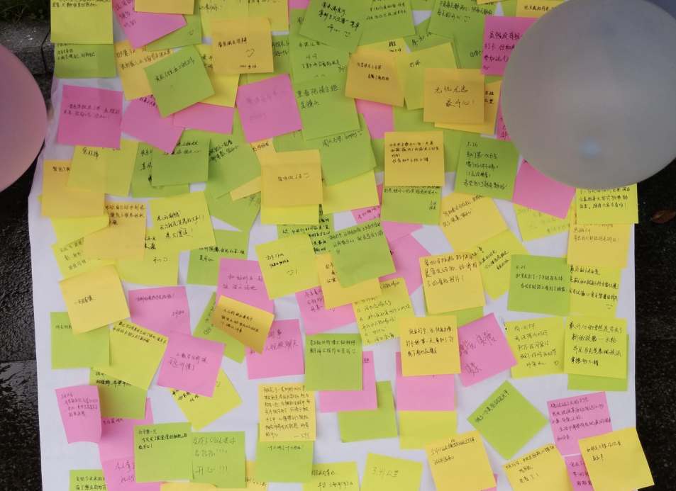 (写有开心的事的便签展板)