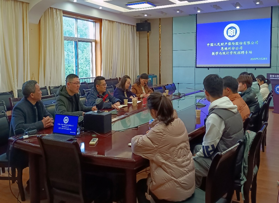 本网讯(记者 杨雪芬 应欣月/文 应欣月/摄)2月28日上午,我院联合中国人民财产保险股份有限公司恩施州分公司在四楼会议室举办招聘会。我院副院长唐利明、数学系主任向中义、学生科科长黄丽娜和恩施州分公司领导史主任、代表覃长征、湛娅男出席本次招聘会。我院十余名应届毕业生到场聆听。