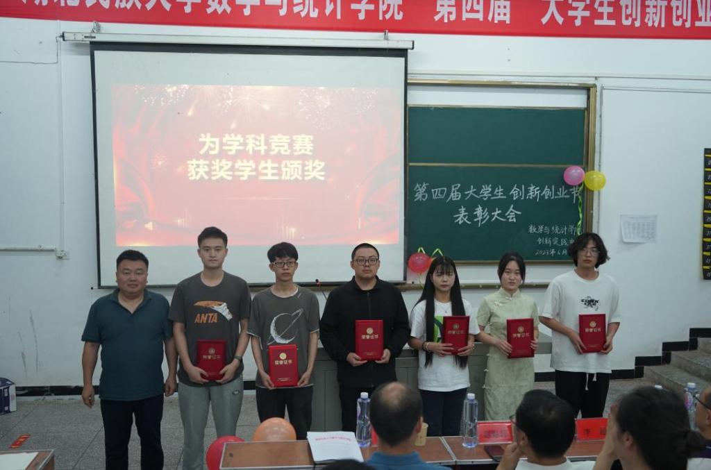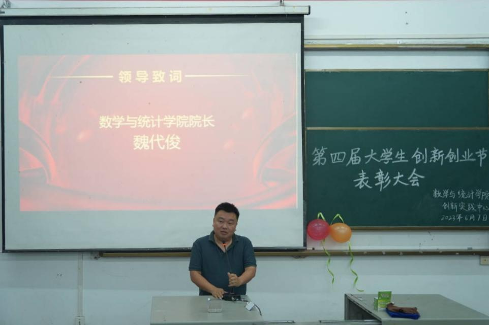 本网讯(曹莎、沈娟/文 向高贤/摄)6月7日晚上七点,我院创新实践中心在数学与统计学院三楼3307教室举行“第四届”大学生创新创业节表彰大会。学院特别邀请创新创业学院副院长李超出席,数学与统计学院党总支书记赵魁轩、院长魏代俊老师、党总支副书记易金桥、学生科科长黄丽娜及创新实践中心全体教师参加本次大会。本次会议由学院统计学专业大二学生杨砚童主持。
