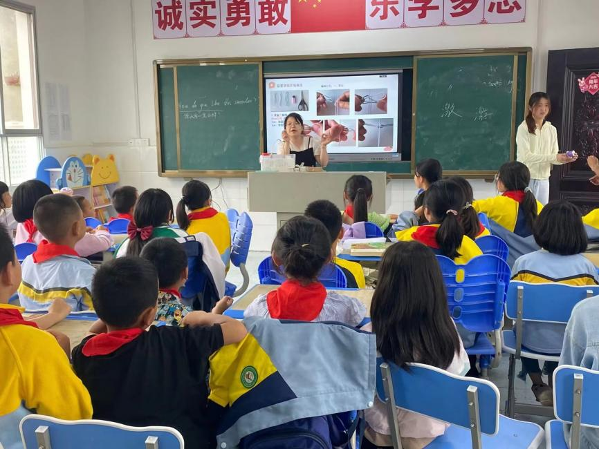 在实践活动中,团队成员深入学校进行各项志愿活动,包括监督陪同学生完成早读任务;带领学生在操场上进行户外活动;前往个人所负责的班级进行授课以及期末考试的监考;整个团队一起组织编手绳课外活动,队员积极地准备材料,并仔细讲解示范编手绳的步骤,同时使用多媒体视频教学,使编手绳变得生动易懂。对于不会操作的学生,队员耐心地手把手示范。课堂氛围高涨,学生配合度高,极大丰富了学生的学习生活。