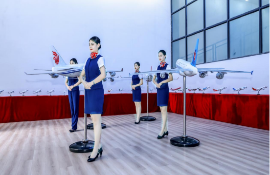 “全景式模拟”实训教学环境。建有融教育教学、技能实训和应急事件处理的一体化仿真模拟训练舱、民航乘务员在线学习中心(CBT实训室)、形体训练室、形象塑造室、飞机模型展厅等教学实训基地。