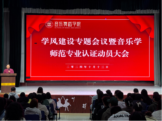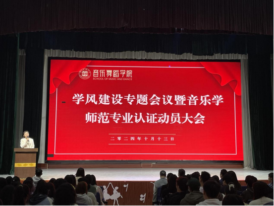 为全面做好音乐学师范专业认证工作,确保顺利通过专家组的进校考查,10月13日,音乐舞蹈学院在演播厅召开学风建设专题会议暨音乐学师范专业认证动员大会。此次大会旨在统一思想,明确目标,凝聚力量,为师范专业认证工作奠定坚实基础。音乐舞蹈学院党总支书记张蕊,院长谷秋阳,副院长王松,学生科科长胡自爱,音乐系系主任张玲玲,全体音乐学班主任及2022级、2023级、2024级音乐学专业学生参会。大会由党总支书记张蕊主持。
