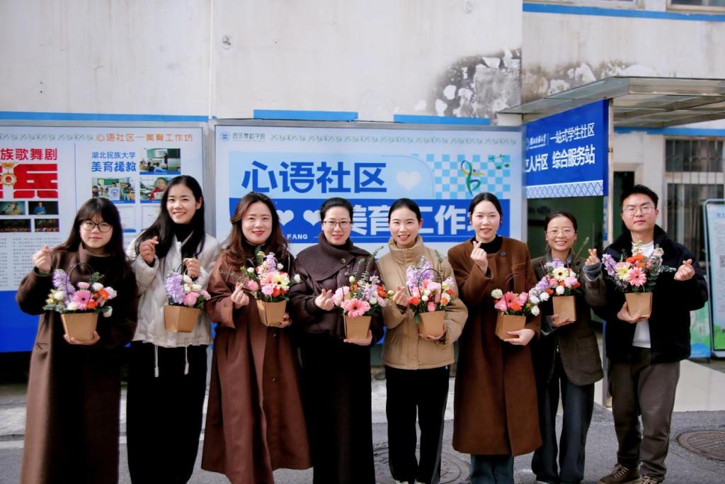 活动尾声,参与者们手捧作品合影留念。春风拂面,花香萦绕,镜头定格下了一张张自信温暖的笑颜。学工处副处长赖申昊感慨:“插花让我感受到专注与放松的平衡,这样的活动既陶冶情操,也让我们在交流中汲取了更多育人智慧。”智能科学与工程学院辅导员王洋老师则表示:“‘她力量’不仅是温柔坚韧,更是智慧与创造力的融合。我们将把这份美好带入工作,助力学生成长成才。“