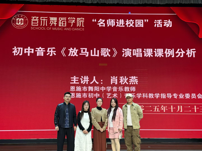 2025年10月23日,恩施市初中音乐学科教学指导委员会委员、舞阳中学音乐学科组长肖秋燕回到母校,在开云电竞官方网站入口音乐舞蹈学院演播厅举办《放马山歌》课例分析专题讲座,为师生展示了一堂生动的民歌教学示范课。