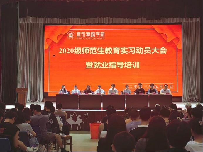 9月8日晚,音乐舞蹈学院在演播厅举行2020级师范生教育实习动员大会暨就业指导培训。音乐舞蹈学院院长谷秋阳、副院长焦娜、党总支副书记邓丽、音乐学专业负责人张玲玲、舞蹈学专业负责人黄涌天、学生科杨倩、2020级音乐学专业班主任单家迪、2020级舞蹈学专业班主任毛伟臣以及2020级全体师范生参与会议,会议由教学科科长梁丹玉主持。