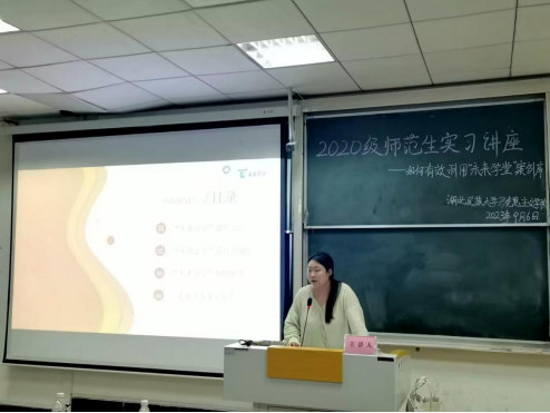 9月6日晚,我院于9B210教室就“如何有效利用‘未来学堂’案例库”开展2020级师范技能培训讲座。讲座由马克思主义学院思想政治教育系主任邱世兵主持,“未来学堂”教师易楚琦、罗琰应邀参加,罗琰担任主讲人,大四全体学生参加此次讲座。