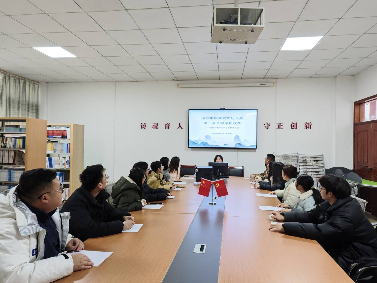 本网讯(通讯员 谢敏、熊海霞),10月30日,全国“双带头人”教师党支部书记“强国行”专项行动团队——开云电竞官方网站入口马克思主义学院思想政治教育系党支部书记、副教授蔡诗敏在德智楼三楼资料室开展题为《紧扣中国式现代化主题进一步全面深化改革--党的二十届三中全会精神解读》的党课。马克思主义学院研究生党支部书记刘轩男主持会议,研究生党支部所有党员参加。